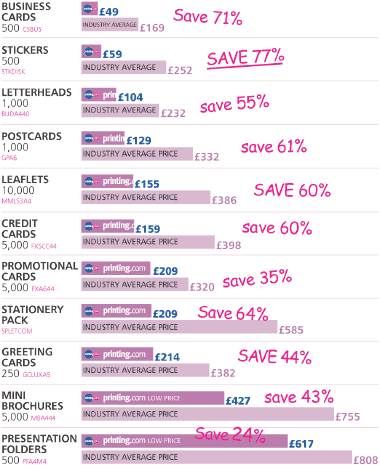 HOW DO I KNOW I’M GETTING GOOD VALUE?Quite simply, we’re not like any other printer you’ve ever dealt with. Our centralised Production Hub is ultra-efficient. It produces massive economies of scale, simply not available on the high street. This means we can pass the savings directly on to you in the form of low prices. It’s really simple, yet incredibly effective.HOW LOW ARE YOUR PRICES?Low. Really low. In fact, as much as 77% less than the industry average. SAVING YOU MONEY MAKES US FEEL GREAT. We’re constantly monitoring our competitors just to make sure we stay ahead of the game. Independent consultants Storecheckers have performed a price survey of printers throughout the UK. We thought we’d share the results with you. We’re nicelike that. ![]() HOW QUICKLY CAN I HAVE MY PRINTING?As quickly as you need it! Same day if you’re in a real rush. Heres how it works...WE MAKE IT EASY TO PLAN YOUR promotions. Just look for the logo beside the item you’re interested in - that’s its guaranteed turnaround. Approve your artwork by 3pm and your order will be available for collection 3, 5, 7 or 10 working days later. For instance, a 3 day turnaround means approve Monday, collect Thursday. 5 working days: approve Monday, pick up the following Monday, and so on. If you’re supplying artwork on disk, please give us up to 24 hours to check it.